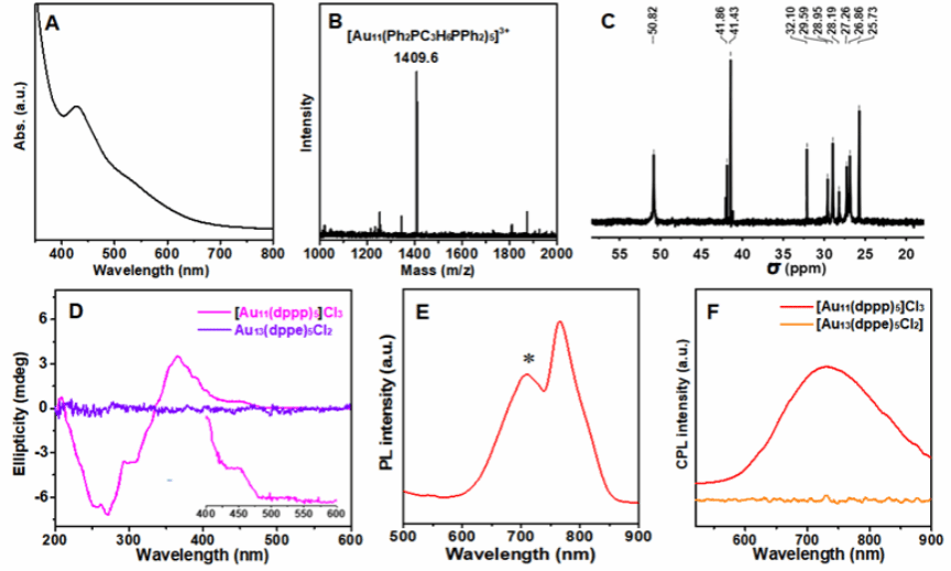 其关键机制在于双齿 dppp 配体在 Au11 核心外层形成张力结构的 ansa-金属大环(Au–P–CH2CH2CH2–P–Au 桥联),这种空间约束打破了簇核的固有对称性,从而赋予其手性结构。单晶衍射进一步确认了该簇的原子结构,并排除了反演或镜像对称性的存在。