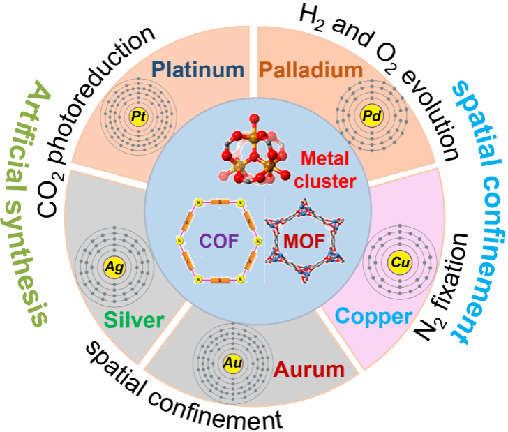 原子精确的金属团簇由于其独特特性,如可调节的尺寸、元素组成和表面化学,已在高性能光催化剂的理性设计中引起广泛关注。本综述介绍了将金属团簇耦合多孔 MOFs 和 COFs 材料光催化系统的最新进展:如 Au、Ag、Pt、Pd 和 Cu金属团簇固定在这些材料的孔隙中,作为高效的光催化平台,可用于污染物降解、产H2 、产H2O2、CO2 转化等应用。大多数金属团簇表现出强烈的局域表面等离子体共振,促进热电子生成以加速光反应。通过控制团簇的尺寸、形态和局部化学环境,可以精细调节这些团簇的 LSPR 性能。通过调节孔隙结构、成分和功能基团,光催化系统的效率和选择性可以显著提高。各种合成技术,包括原子层沉积、原位封装、自组装、表面锚定、受限空间内的热解、一氧化碳还原、热蚀刻和光诱导沉积,用于固定团簇。通过共价键、配位键或静电键作用,能够提高负载能力和光催化性能。多孔材料的模块化合成和战略性单体选择可以精确调节结构特性,从而实现对嵌入簇的催化活性和结构耐久性的精细调整。本文综述了这些包封体系在合成方法学和光催化应用方面的关键进展。