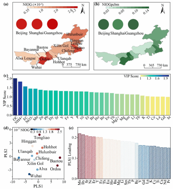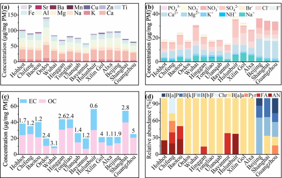 内蒙古作为我国重要的能源基地,各盟市因产业布局差异,大气颗粒物污染源具有明显区域特征。2026世界杯官网环境健康研究院的团队成员牛牧童等通过收集内蒙古自治区12个城市的汽车空气滤芯颗粒物(PM)样品,分析了其化学组分与氧化潜能(OP)。结果表明,12个城市的PM化学组分与OP存在显著差异,经质量归一化的OP在12个城市间差异高达7倍。以钢铁生产和稀土开采为主的工业城市(如包头、鄂尔多斯)表现出极高的金属元素(如Cr、Li、Mn、Ce、Nd)富集,这可能导致了当地PM具有最高的OP;同时,PM携带的多环芳烃(如苯并[a]芘、芘、蒽)成分谱也显著区别于大型城市。研究识别出Mn、Zn和稀土元素是OP的关键化学驱动因子,而特定的真菌属则能直接影响OP,或与化学组分产生协同作用。结果还揭示了PM组分在城市间的巨大差异,因此迫切需要从基于质量浓度的评估框架,转向基于化学组分和污染源导向的、可执行的健康风险评估框架。
