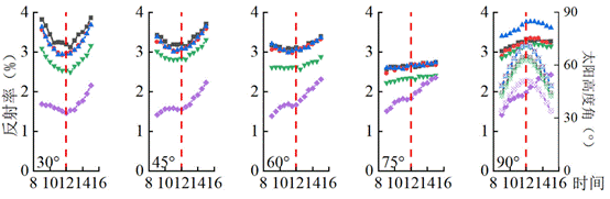 图2. 2021年5-9月观测区内531nm波段的5种观测高度角下的反射率变化趋势图