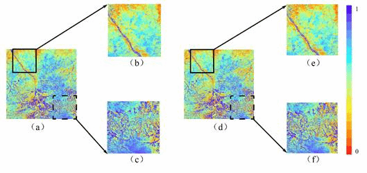 图3.观测角校正前(a)和校正后(d)的NDVI图像