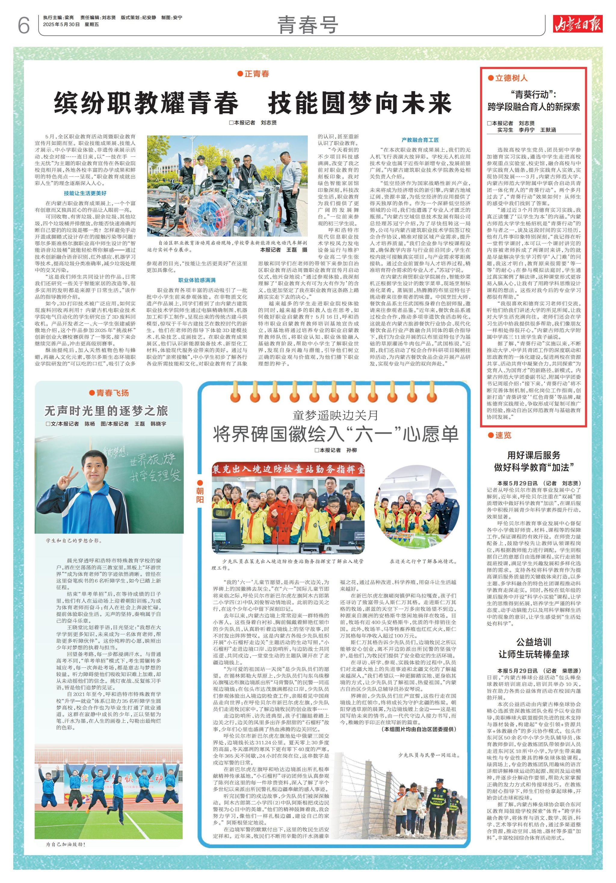 《内蒙古日报》2025年5月30日第6版以《“青葵行动”: 跨学段融合育人的新探索》为题,报道世界杯官网加快促进高等教育与基础教育协同提质相关工作。
