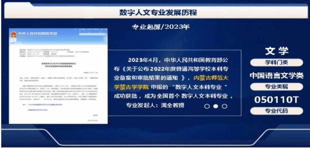 获批全国首个数字人文专业,培育新质生产力复合型人才。2023年,满全带领团队成功申报“数字人文本科专业”,是全国首个数字人文本科专业,2024年软科评级为A+。2025年1月12日,全国“数字人文专业发展联盟”成立,与全国联盟高校、科研机构及文化企业,一起大力培育数字人文与人工智能领域复合型人才,为新质生产力蓬勃发展注入强劲动力,有力推动经济社会高质量发展,《人民日报》《光明日报》《内蒙古日报》以及光明网、央广网等权威媒体对此进行专题报道,引发广泛社会反响。
