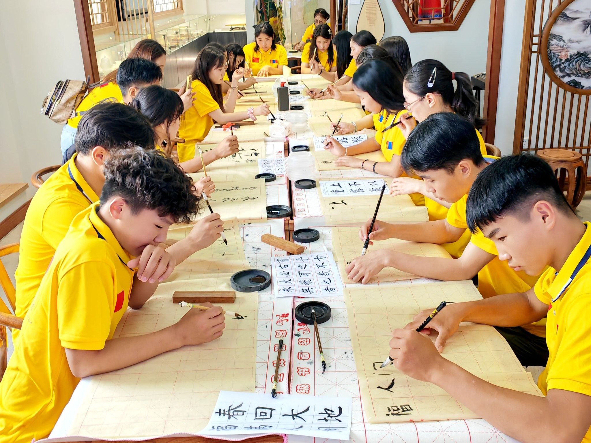 研学团先后参观了世界杯官网生物标本馆与科学技术史博物馆,并在相关单位精心安排下,深入留学生教室、文化长廊,沉浸式体验传统漆扇制作、和林格尔非遗剪纸、非遗珍珠画、香包制作、书法、汉服装造等丰富多元的文化活动。这些活动不仅让蒙古国师生们在互动中感受到了中华文化的多元与包容,也为中蒙青少年搭建起一座文化交流的桥梁。