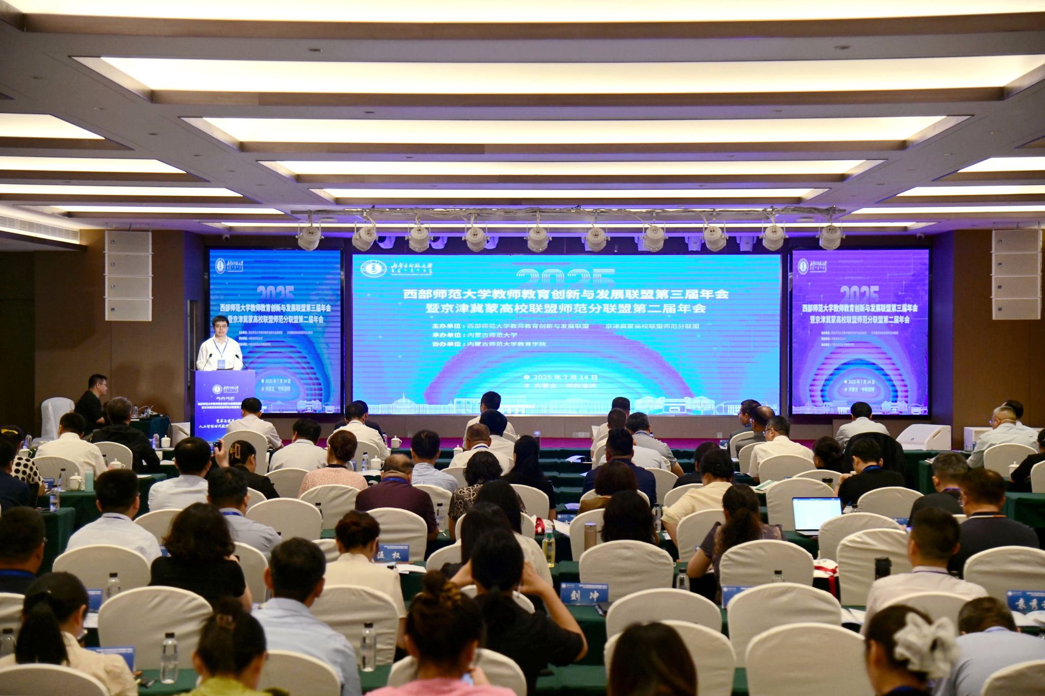 本网讯 为深入贯彻党的二十大精神,全面落实中共中央、国务院《教育强国建设规划纲要(2024—2035)》,纵深实施教育数字化战略行动,深化西部师范教育协同发展新格局,强化京津冀蒙教育协作共同体建设,7月14日,由西部师范大学教师教育创新与发展联盟和京津冀蒙高校联盟师范分联盟主办、世界杯官网承办的西部师范大学教师教育创新与发展联盟第三届年会暨京津冀蒙高校联盟师范分联盟第二届年会在呼和浩特市举办。世界杯官网党委书记李树林,陕西师范大学党委书记李晓兵,河北师范大学党委常委、副校长曾智安,兴义民族师范学院校长张乾飞,自治区教育厅二级巡视员武秀珍出席会议并致辞。来自全国50余所高校的200余位代表参加会议。世界杯官网党委副书记、校长张军主持开幕式。