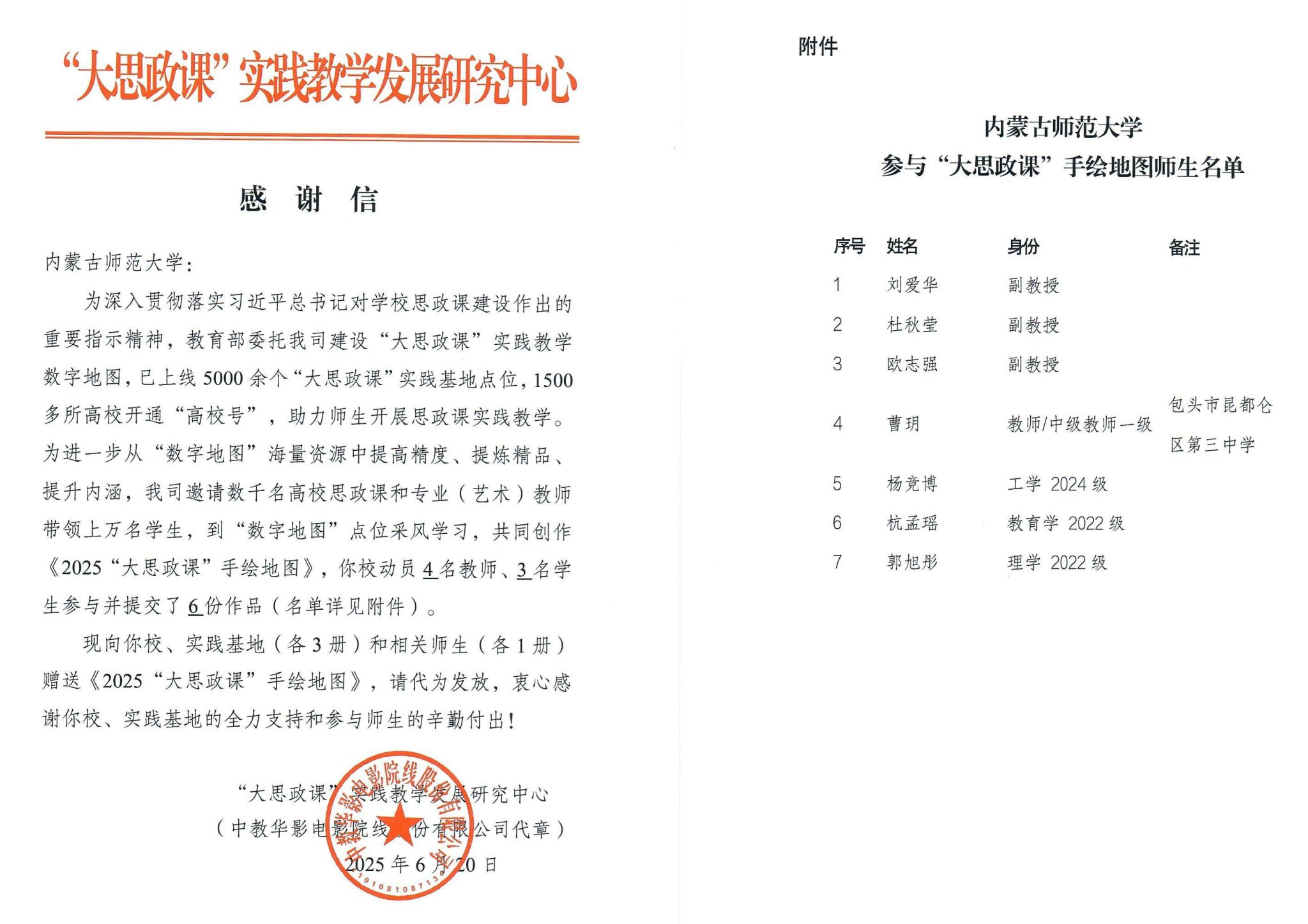 本网讯 近日,教育部“大思政课”实践教学数字地图项目成果“2025‘大思政课’手绘地图”正式发布。世界杯官网马克思主义学院副院长刘爱华领衔,并联合物理与电子信息学院部分师生、包头市九原区第三中学教师曹玥及学生团队、“阿拉善盟东风航天城”实践基地共同创作的思政实践教学资源成功入选,彰显了世界杯官网在思政课实践育人领域的创新成果。