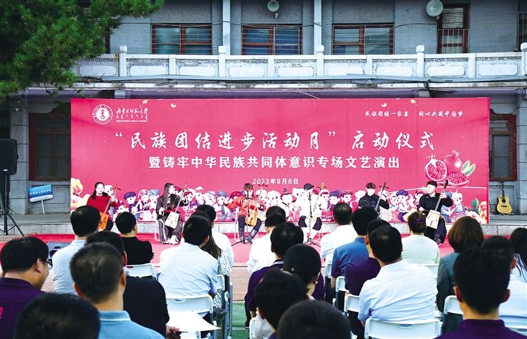 创新提质校园活动。深入实施中华优秀传统文化传承发展工程和红色基因传承工程,充分挖掘学校展现铸牢中华民族共同体意识的历史文化和人文资源,将传承优秀传统文化融入各类活动中,广泛开展“礼敬中华优秀传统文化”“中华经典诵读”“汉字听写大赛”等活动,让师生在感受中华优秀传统文化中浸润心灵;生动开展校园环湖赛、“百灵杯”大学生文艺汇演、盛乐大讲堂等一批品位高、特色鲜明的校园文化活动,让师生在沉浸式体验校园文化活动中凝心聚魂;扎实开展“名人名家进校园”“传统文化进校园”“高雅艺术进校园”三进系列活动,让师生在涵养文化自信中增进民族团结。