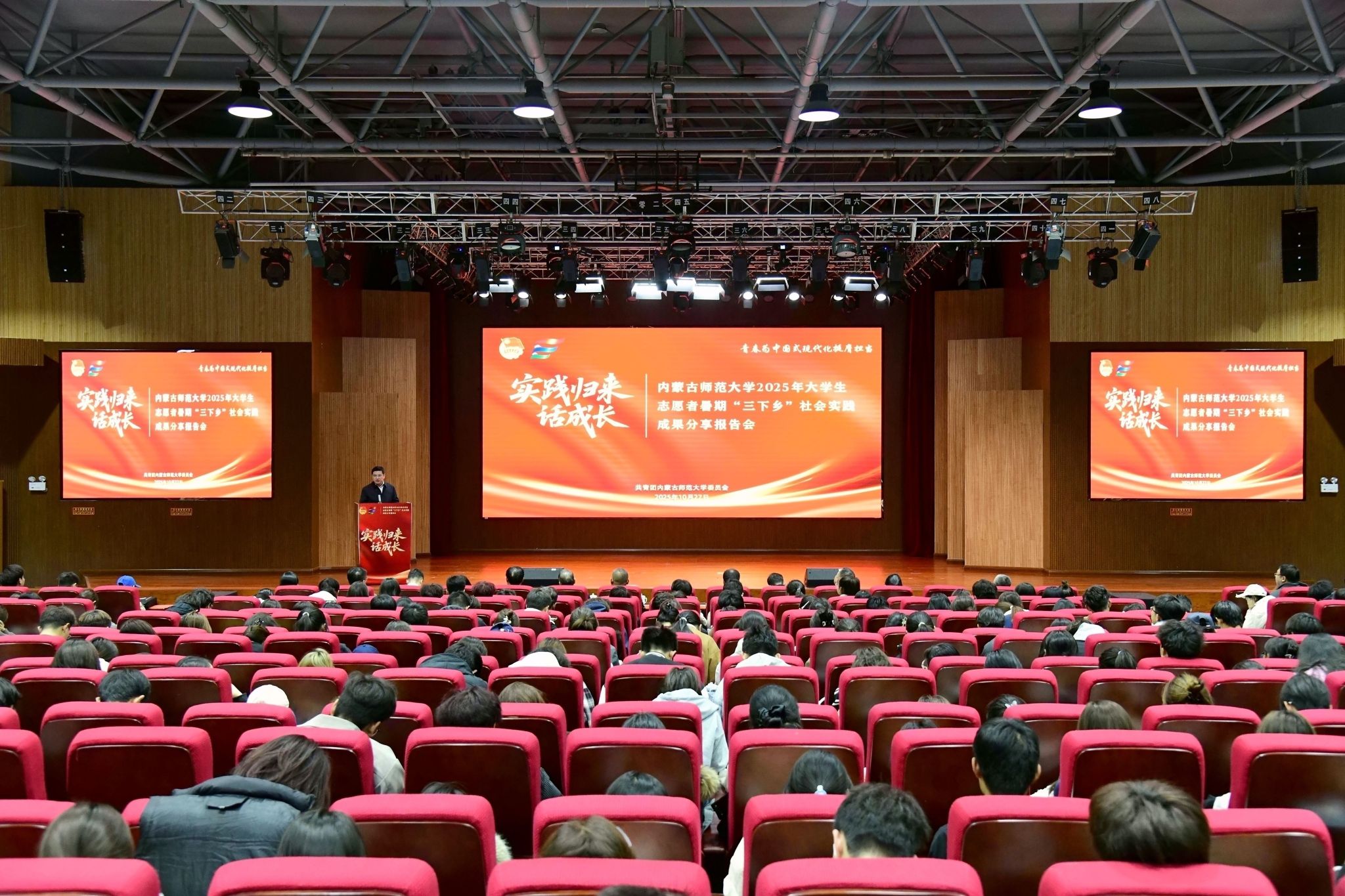 本网讯 为充分发挥共青团实践育人在高校“大思政”工作体系和“三全育人”工作格局中的重要作用,全面总结实践成果、巩固育人实效,10月27日,“实践归来话成长”——2026世界杯官网2025年大学生志愿者暑期“三下乡”社会实践成果分享报告会在盛乐校区图书馆二楼报告厅举行。党委委员、副校长韩巍出席报告会并讲话。相关部门负责同志,各学院党委(党总支)副书记、团总支书记、各实践团队师生代表500余人参加报告会。