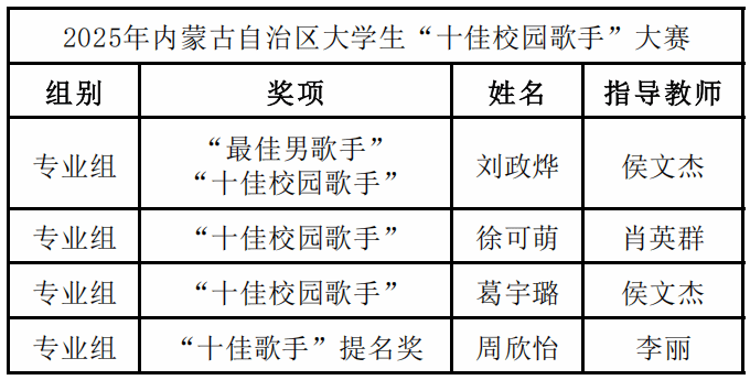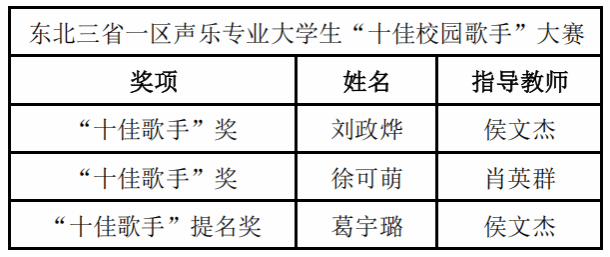 经过激烈角逐,在2025年内蒙古自治区大学生“十佳校园歌手”大赛中,世界杯官网音乐学院刘政烨荣获“最佳男歌手”,徐可萌等3名同学荣获“十佳校园歌手”,周欣怡荣获“十佳歌手”提名奖。在东北三省一区声乐专业大学生“十佳校园歌手”大赛中,世界杯官网音乐学院刘政烨等2名同学荣获“十佳歌手”奖,葛宇璐荣获“十佳歌手”提名奖。