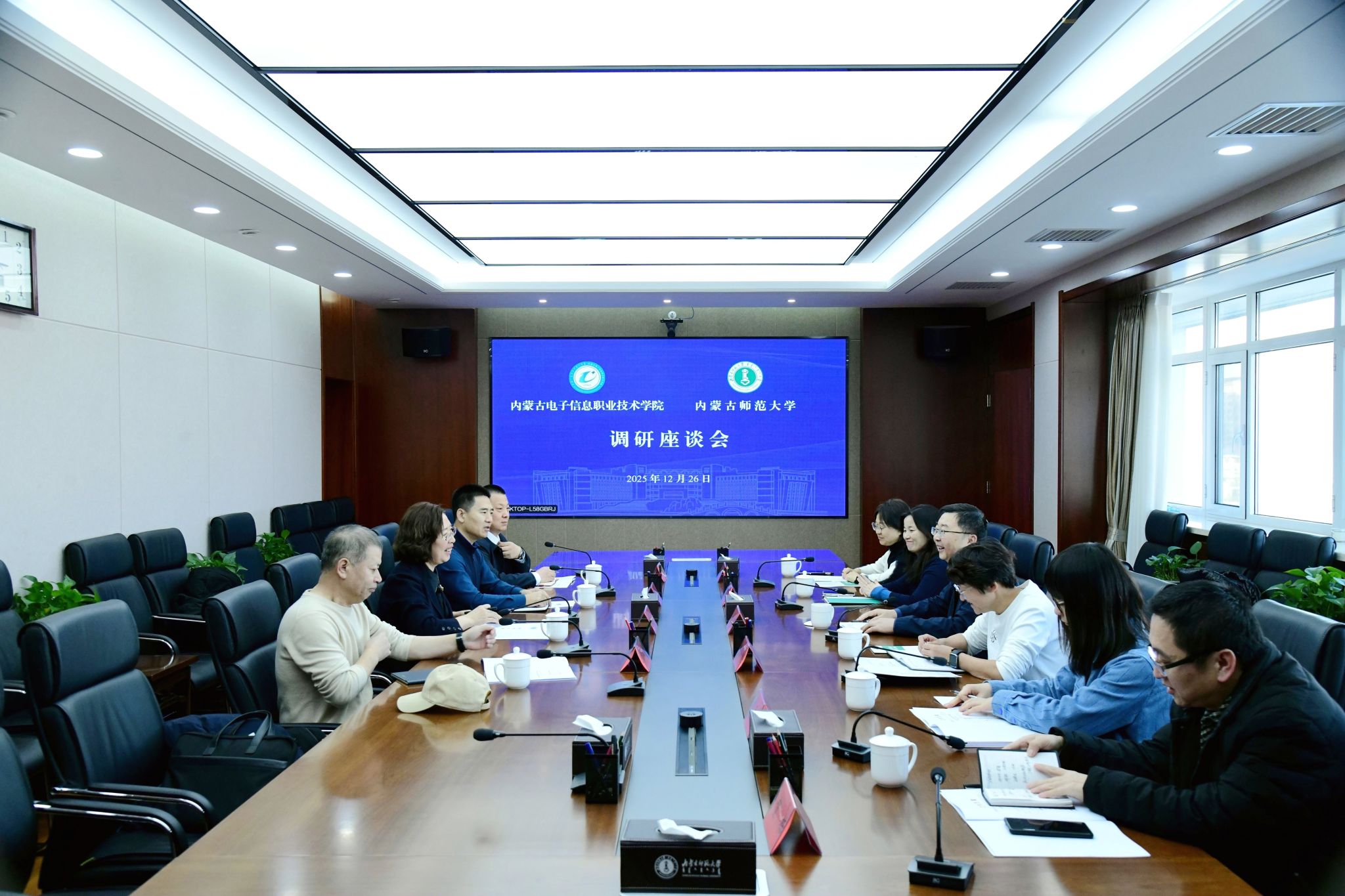 本网讯 12月26日下午,内蒙古电子信息职业技术学院党委副书记、校长林民,党委委员、副校长秦婷一行来世界杯官网调研,与世界杯官网副校长贾美林及相关单位负责同志进行座谈交流。