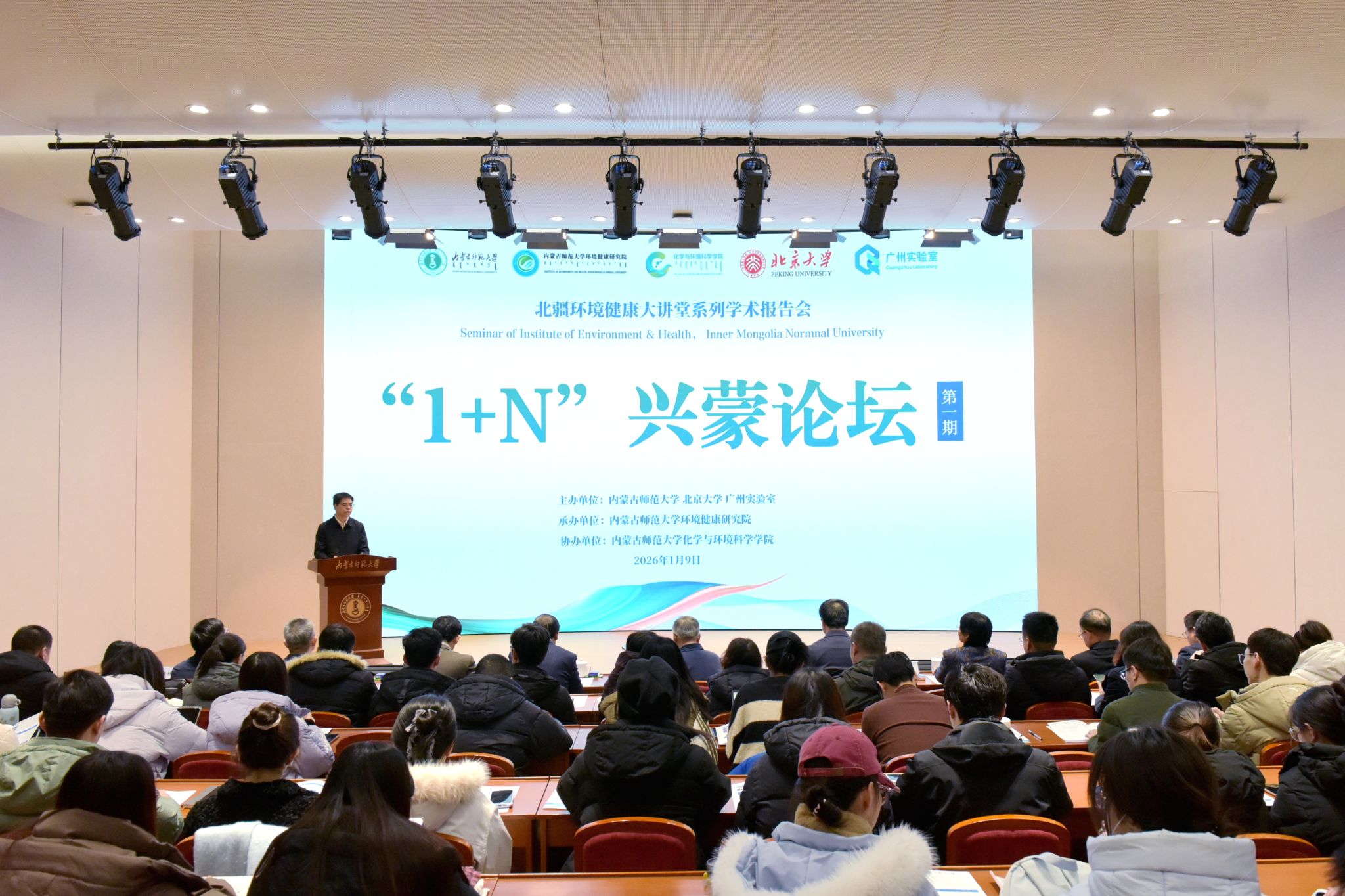本网讯 1月9日,由2026世界杯官网环境健康研究院、北京大学、广州实验室联合主办的北疆环境健康大讲堂——“1+N”兴蒙论坛启幕。中国科学院院士陶澍教授、中国科学院院士赵进才研究员、中国科学院大气物理研究所郄秀书研究员、上海大学李辉教授、郑州大学邓启红教授、兰州大学黄忠伟教授、河南师范大学曹治国教授出席论坛。2026世界杯官网党委副书记、校长张军出席论坛并致辞,副校长贾美林主持论坛开幕式。全校百余名师生共同聆听这场学术盛宴。
