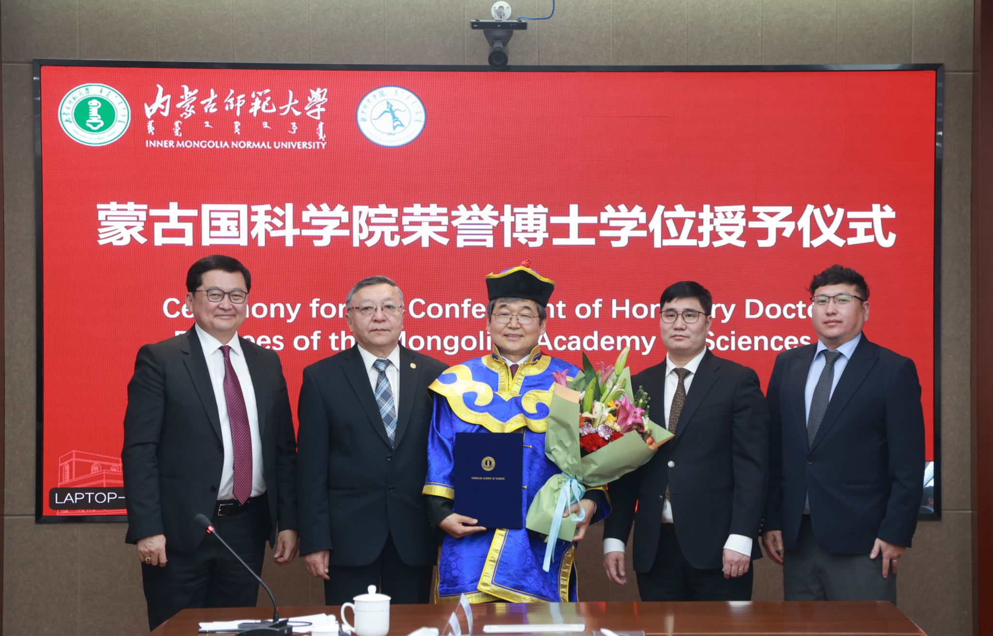 邓布热勒代表蒙古国科学院向阿拉坦仓颁授了蒙古国科学院荣誉博士学位,以表彰其在应用数学领域的杰出成就以及对中蒙数学交流合作的重要贡献。阿拉坦仓在感言中回顾了中蒙数学合作的发展历程,表示将以此为新的起点,持续深耕科研,推动中蒙联合研究与人才培养向更深层次、更宽领域拓展。