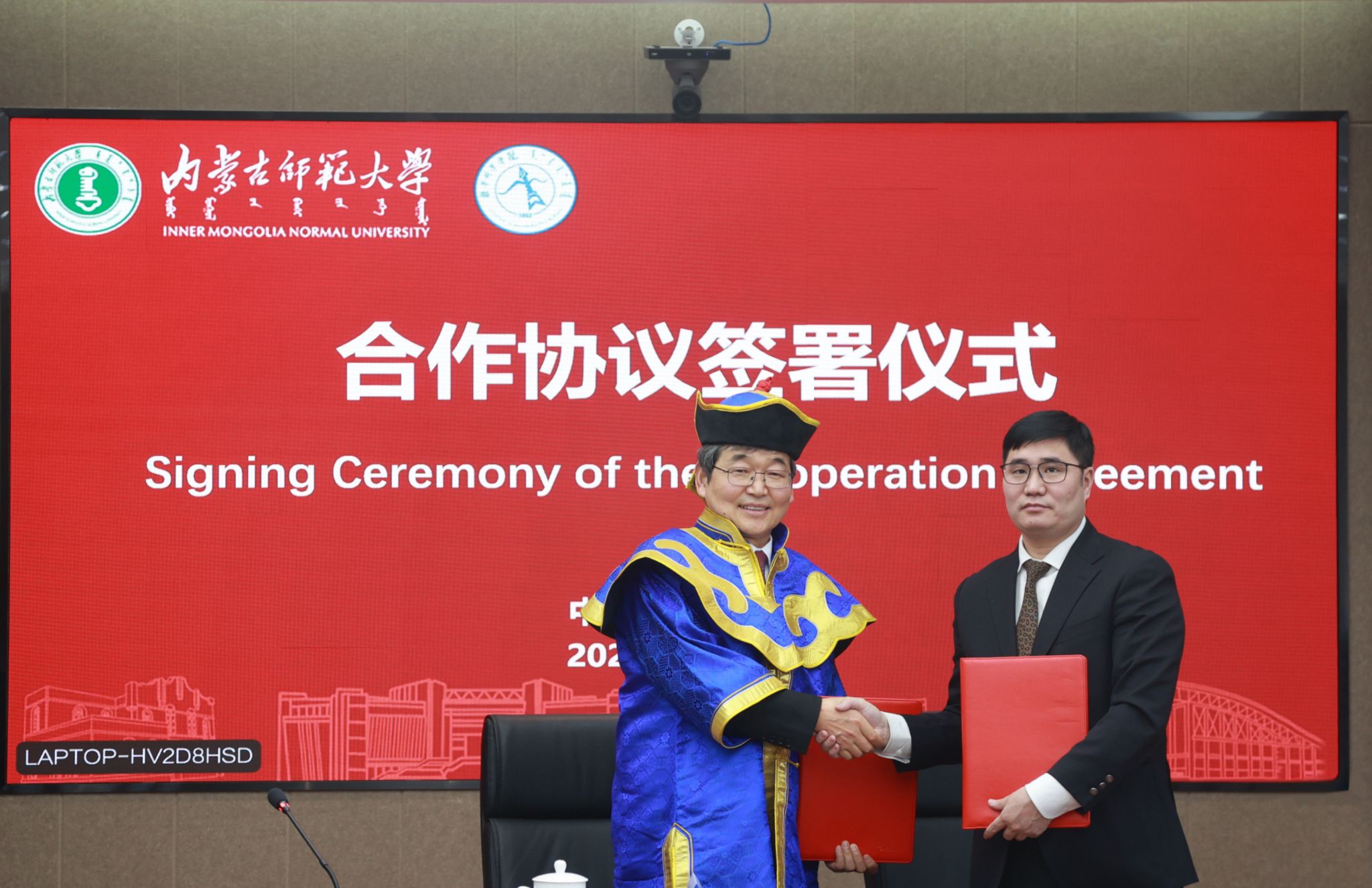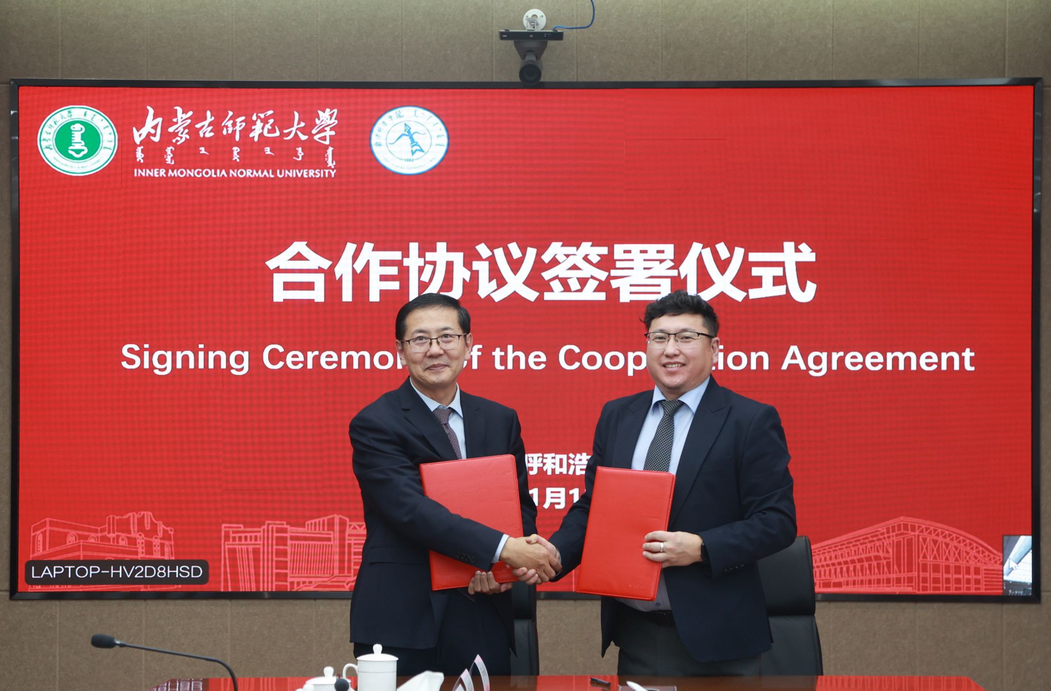 数学科学学院院长扎其劳代表内蒙古自治区应用数学中心与蒙古国科学院数学与蒙古国科学院数字技术研究所所长蒙克额尔德尼签署科学研究合作协议