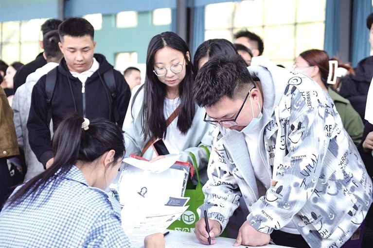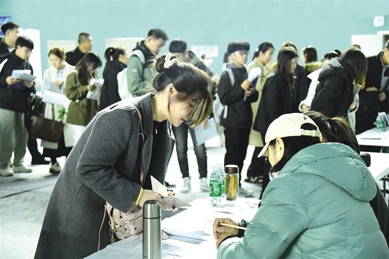 招聘会上毕业生投递简历。