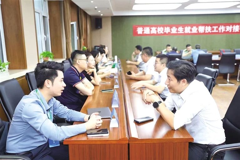 在普通高校毕业生就业帮扶工作对接会上,用人单位与高校面对面对接。