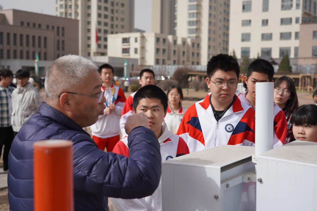 随后,大家有序来到室外观测场,在工作人员的指导下,大家逐一了解了地温场、降水天气现象仪、百叶箱、雨量筒等地面气象观测设备用途和工作原理。