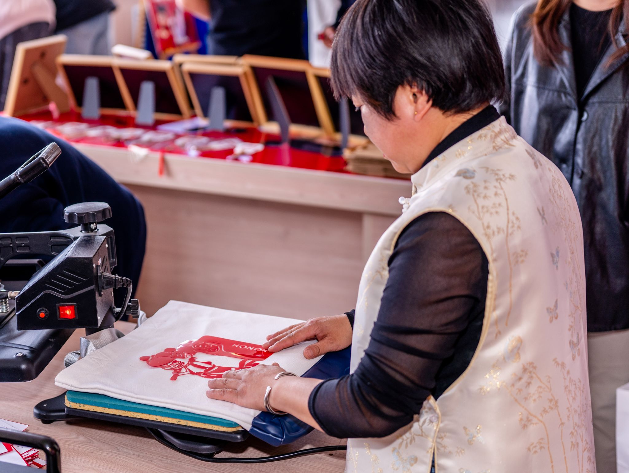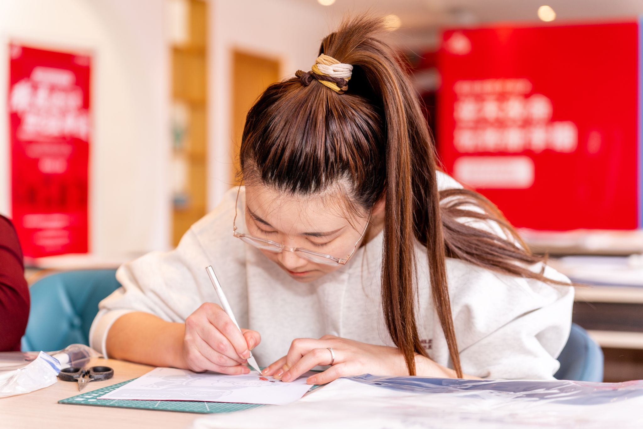 活动中,大家以近期热播的国产动画电影《哪吒之魔童闹海》为切入点,将传统剪纸技艺与现代流行文化相结合。"哪吒的形象既有传统戏曲的造型特点,又融合了现代审美,特别适合用剪纸语言表现。"崔霞一边讲解,一边手持红纸示范,剪刀翻飞间,活灵活现的哪吒形象瞬间跃然纸上。