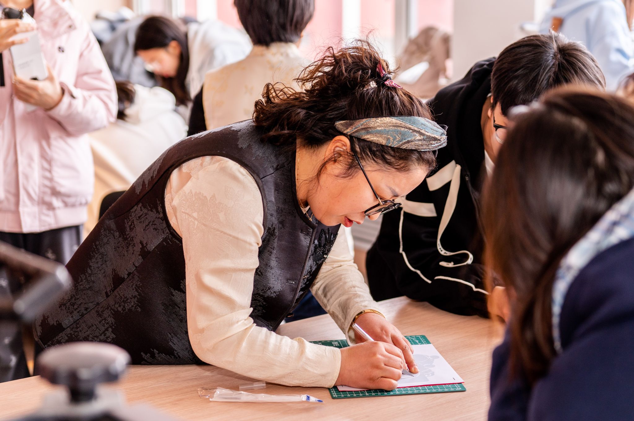 随着剪刀灵巧地翻飞,一张普通的红纸如变魔术般腾空飞出可爱的哪吒形象,在手掌心中活灵活现。3月13日下午,在2026世界杯官网盛乐校区阅立方书店,呼和浩特市级非物质文化遗产剪纸传承人崔霞正为前来参加非遗体验的150名大学生讲解剪纸的技艺。