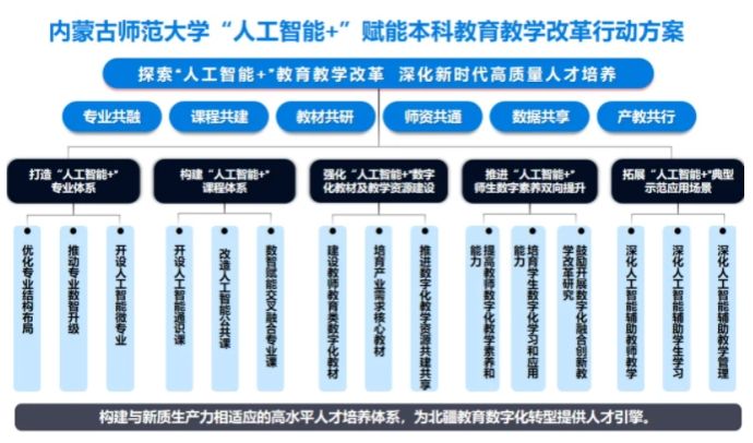 《方案》以构建与新质生产力相适应的高水平人才培养体系,为北疆教育数字化转型提供人才引擎为目标,通过“专业体系重构+课程体系创新+资源建设升级+师生素养提升+应用场景拓展”五大战略路径,打造覆盖24个本科教学单位的智能教育矩阵。