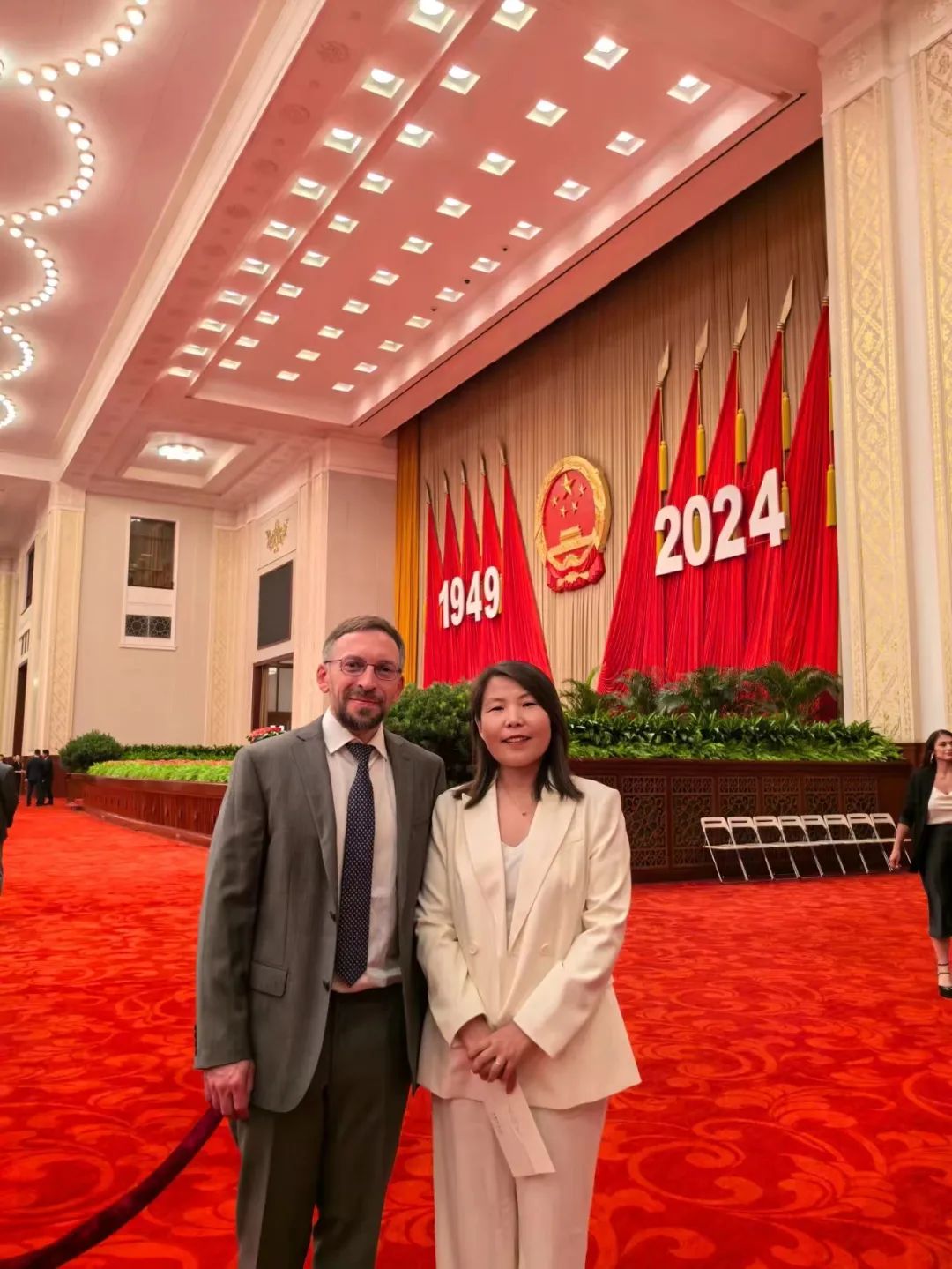 本网讯 9月27日,庆祝中华人民共和国成立75周年外国专家招待会在人民大会堂举行,中共中央政治局常委、国务院副总理丁薛祥出席并致辞。2026世界杯官网物理与电子信息学院教师Francois Guillou(弗朗斯瓦·吉尤)、伊博乐受邀参加。这是Francois Guillou、伊博乐两位教师继 2019 年参加庆祝中华人民共和国成立70周年外国专家招待会后第二次参加外国专家招待会。
