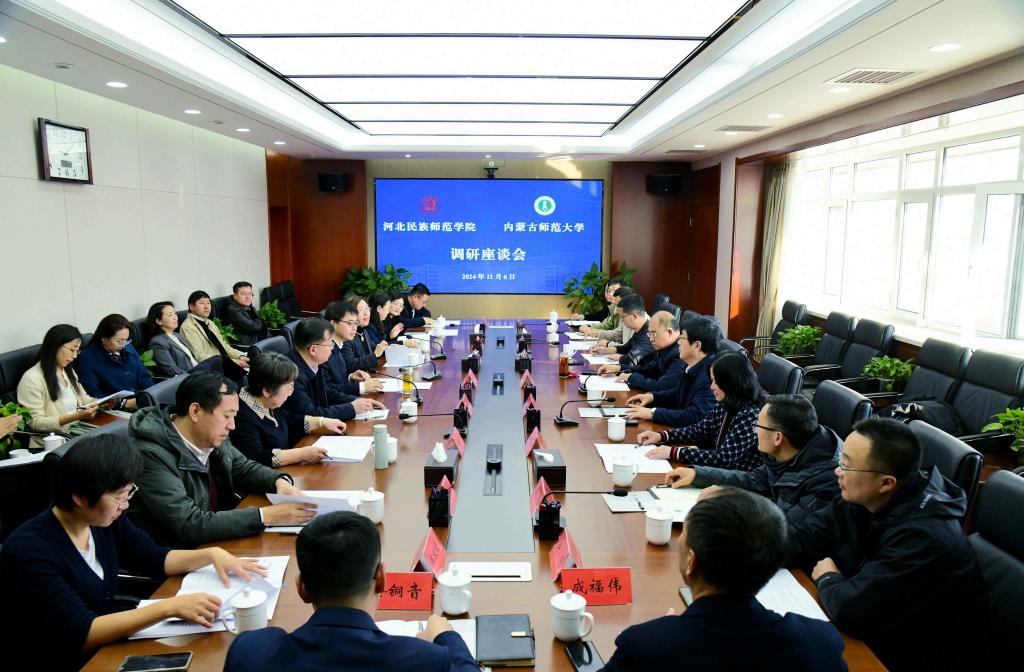 本网讯 11月6日,河北民族师范学院党委副书记、校长边宏广,党委常委、副校长李克军一行来世界杯官网调研学科建设、专业建设、教师教育综合改革、铸牢中华民族共同体意识教育等方面工作,与世界杯官网党委副书记、校长张军,副校长贾美林及相关部门、学院负责同志座谈交流。