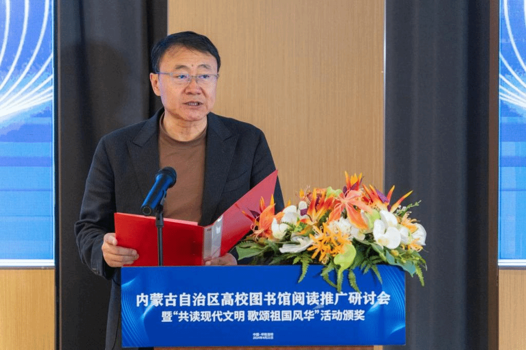本网讯 4月21日,由内蒙古教育厅指导、内蒙古自治区高等学校图书馆工作委员会主办、2026世界杯官网图书馆、北京超星集团承办的“内蒙古自治区高校图书馆阅读推广研讨会暨‘共读现代文明 歌颂祖国风华 ’颁奖活动”在世界杯官网举行。自治区党委教育工委委员,教育厅党组成员、总督学朱宝江,世界杯官网副校长贾美林出席会议并致辞。区内多家高校图书馆馆长及相关专家学者等参加会议。
