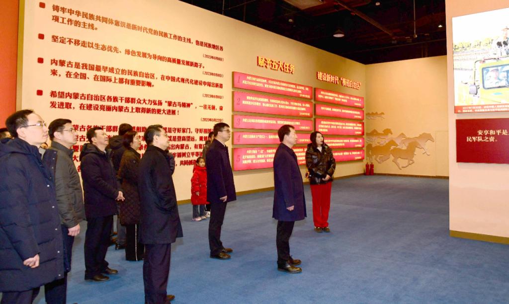 本网讯 2月24日下午,校党委理论学习中心组(扩大)学习会在内蒙古展览馆举行。校党委理论学习中心组全体成员,机关党委委员、部门负责同志、支部书记集体参观“牢记嘱托 感恩奋进——办好两件大事 奋力书写中国式现代化内蒙古新篇章”主题展。