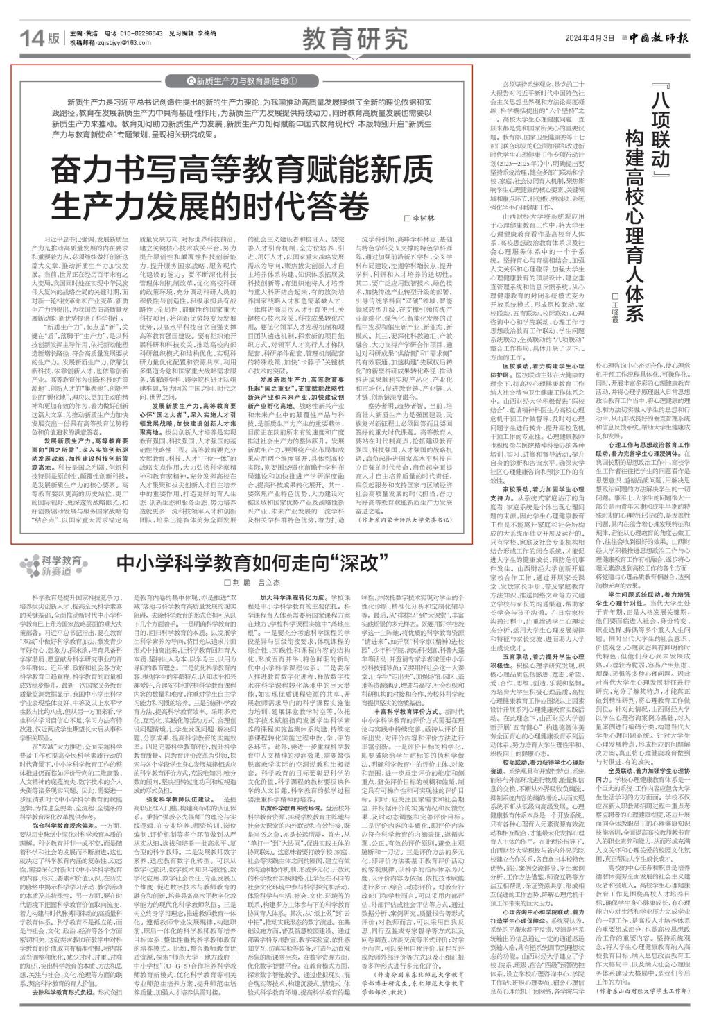 《中国教师报》4月3日第14版全文刊载世界杯官网党委书记李树林署名文章《奋力书写高等教育赋能新质生产力发展的时代答卷》,全文如下。