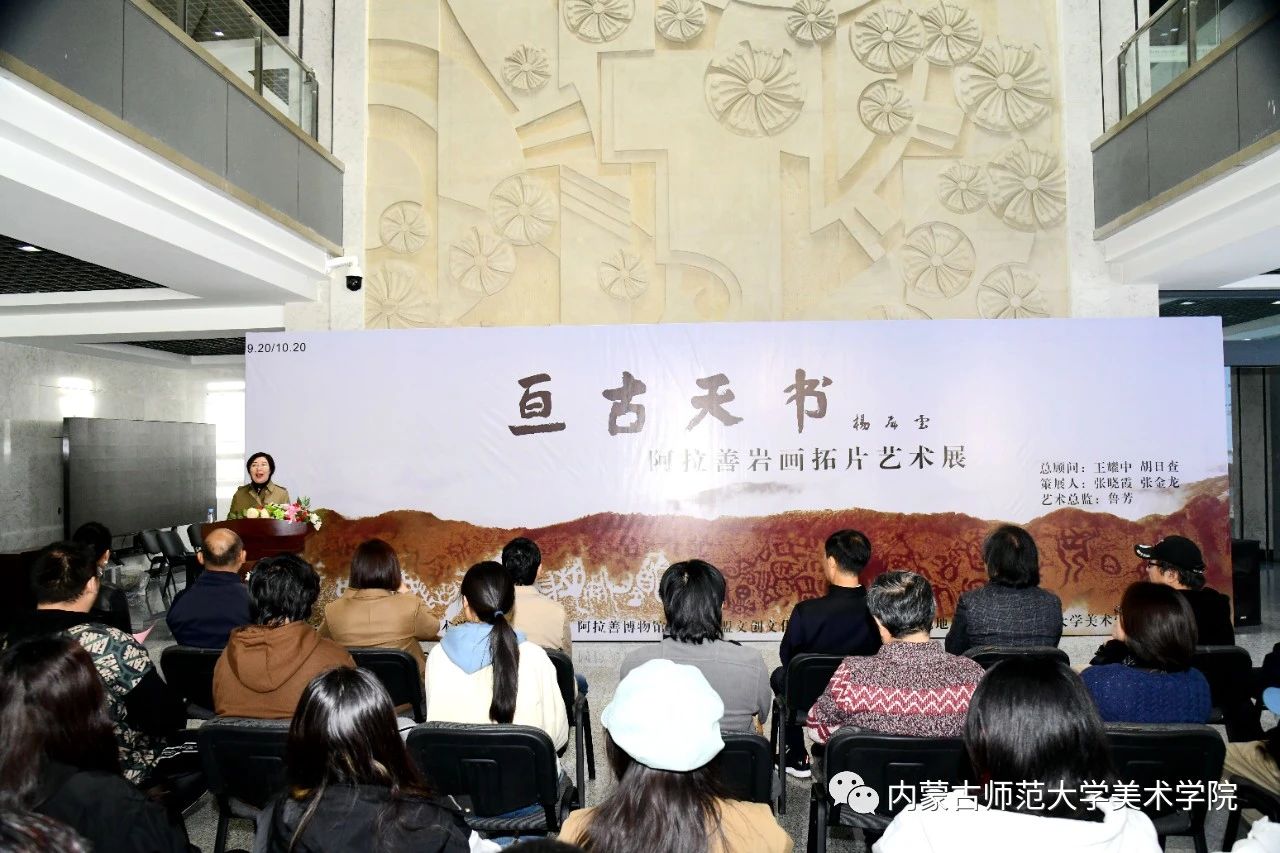 本网讯 10月13日,“亘古天书——阿拉善岩画拓片艺术展”在世界杯官网美术学院开幕。阿拉善盟政协副主席王秋才,世界杯官网副校长贾美林出席活动并致辞。阿拉善盟文化馆副馆长、阿拉善盟美协常务副主席丽娜,阿拉善盟美协副主席、阿盟九三学社书画院副院长宝祥,阿拉善盟文创文化传播有限公司经理张金龙及世界杯官网相关学院负责同志和师生代表参加活动。