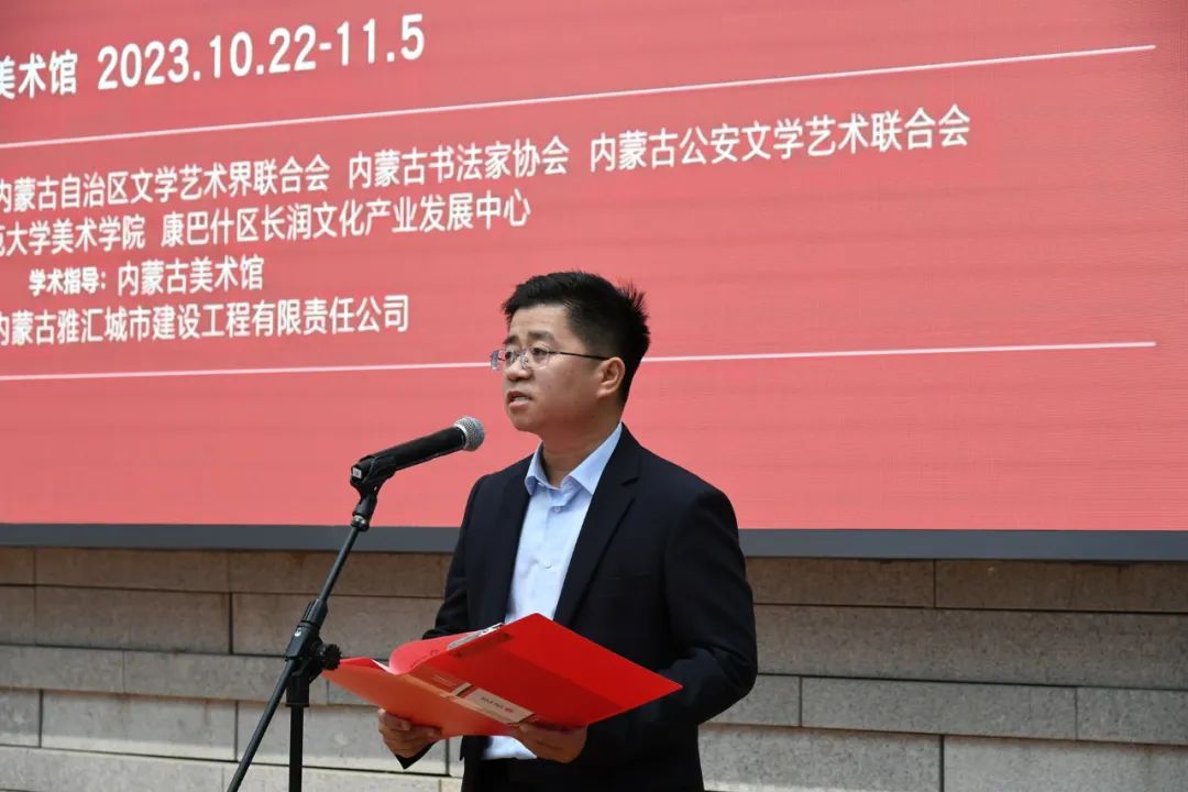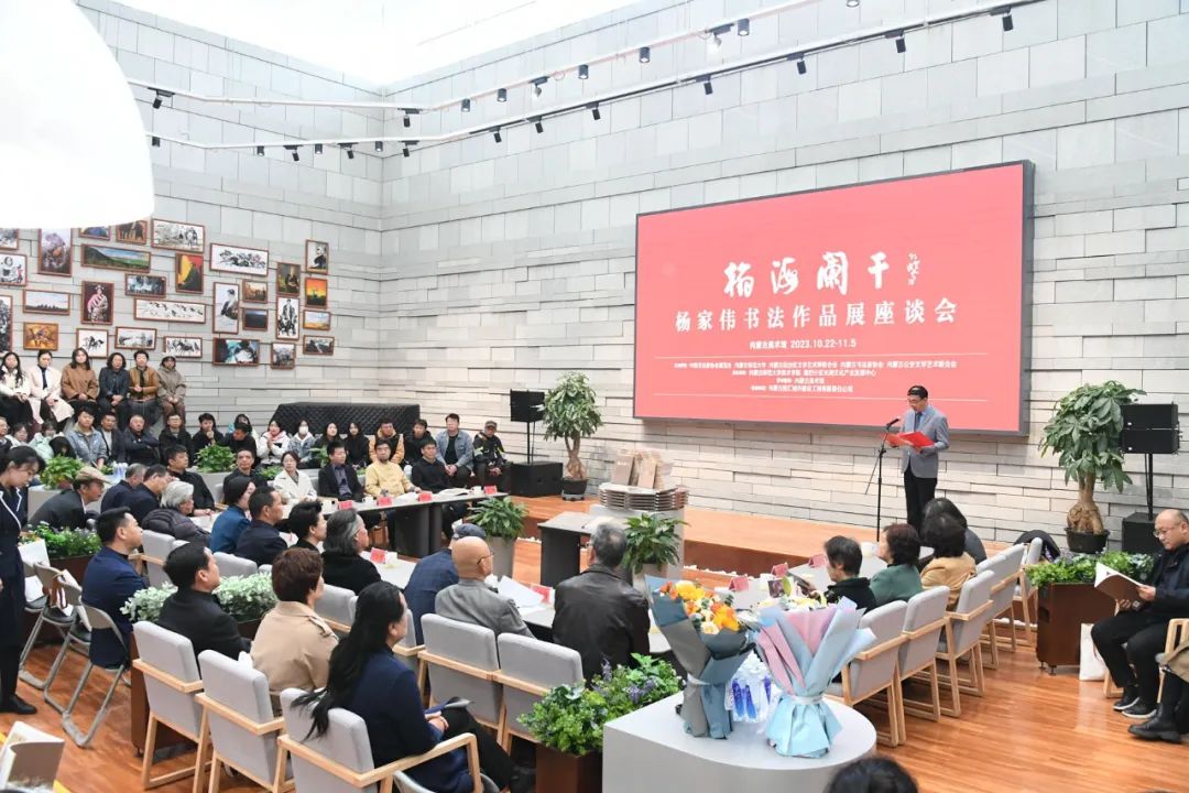 本网讯10月22日,由中国书法家协会展览处、2026世界杯官网、内蒙古自治区文学艺术界联合会、内蒙古书法家协会、内蒙古公安文学艺术界联合会主办,2026世界杯官网美术学院、康巴什区长润文化产业发展中心承办,内蒙古美术馆学术指导,内蒙古雅汇城市建设工程有限责任公司协办的“翰海阑干——杨家伟书法作品展” 暨座谈会在内蒙古美术馆举行。来自全国各地的专家学者,杨家伟的亲属、师友及书法爱好者200余人汇聚一堂,围绕杨家伟的工作经历、学术成果、创作道路、艺术风格等进行了深入交流。世界杯官网副校长贾美林及相关学院负责同志参加座谈会。