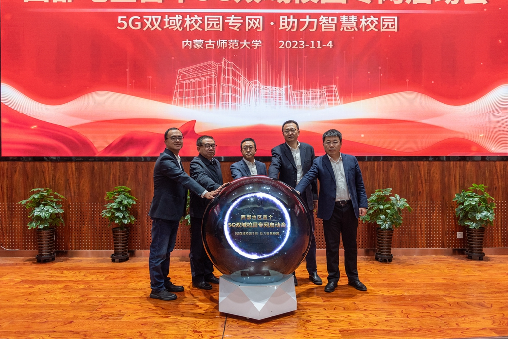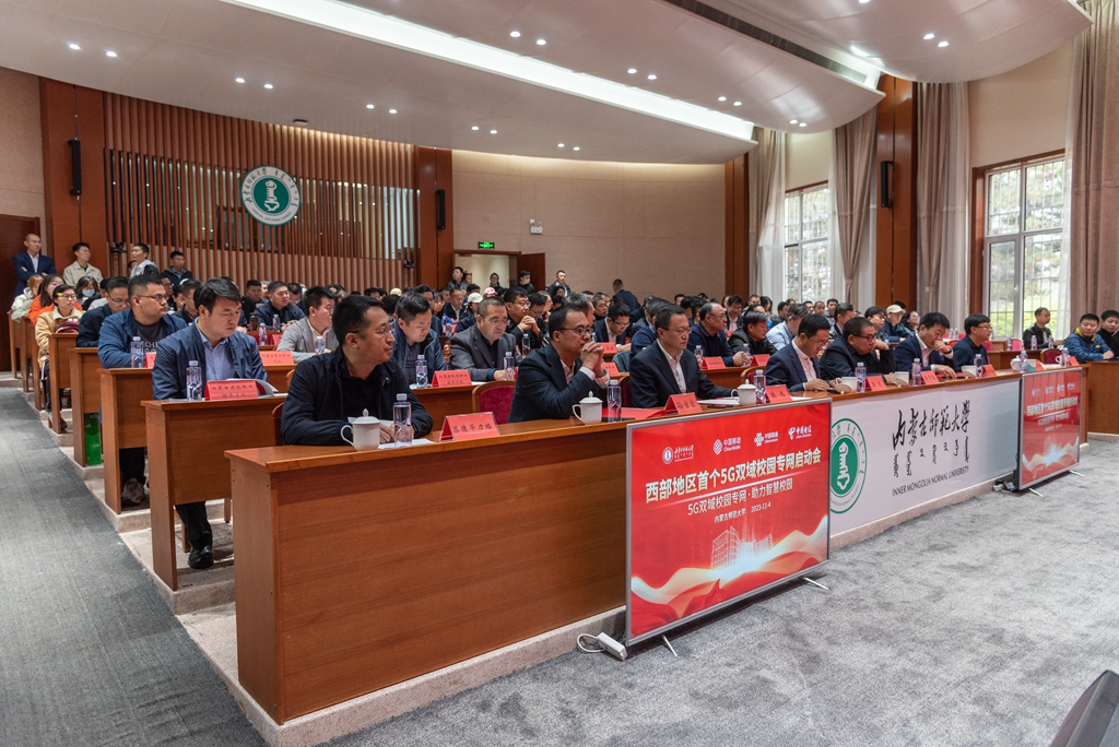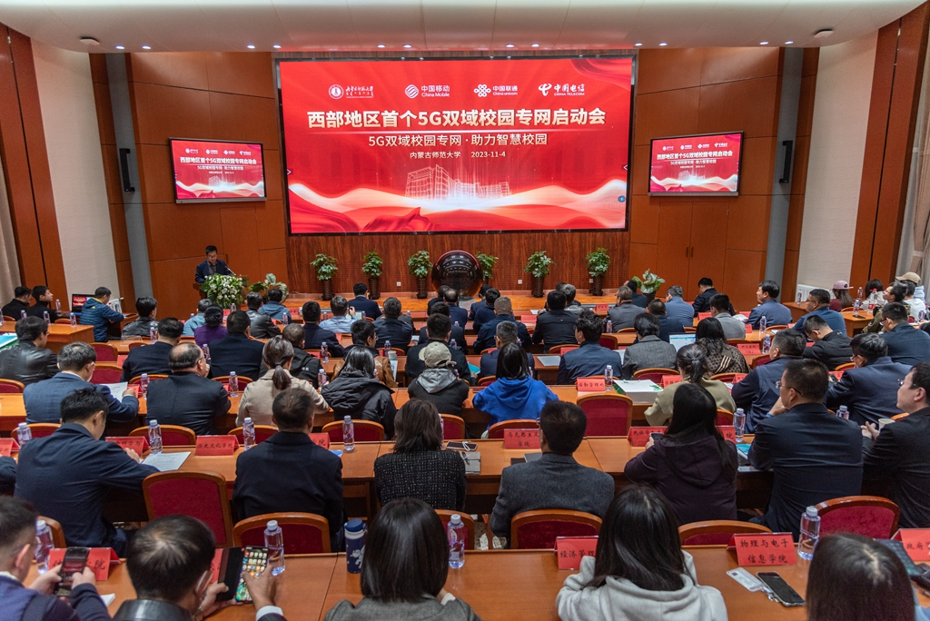 本网讯 11月4日上午,“2026世界杯官网5G双域校园专网”启动会在赛罕校区信息楼学术报告厅召开。自治区教育厅科技与信息化处副处长傅聿韬,中国移动通信集团内蒙古有限公司副总经理韩伟,中国联合网络通信有限公司内蒙古分公司副总经理韩敏,中国电信股份有限公司内蒙古分公司副总经理孙宝宏,北京派网软件有限公司教育医疗事业部总监赵奇峰,世界杯官网党委委员、副校长斯钦出席会议。内蒙古大学、内蒙古工业大学、内蒙古农业大学等兄弟院校及世界杯官网各部门、学院有关负责同志、师生代表100余人参加会议。