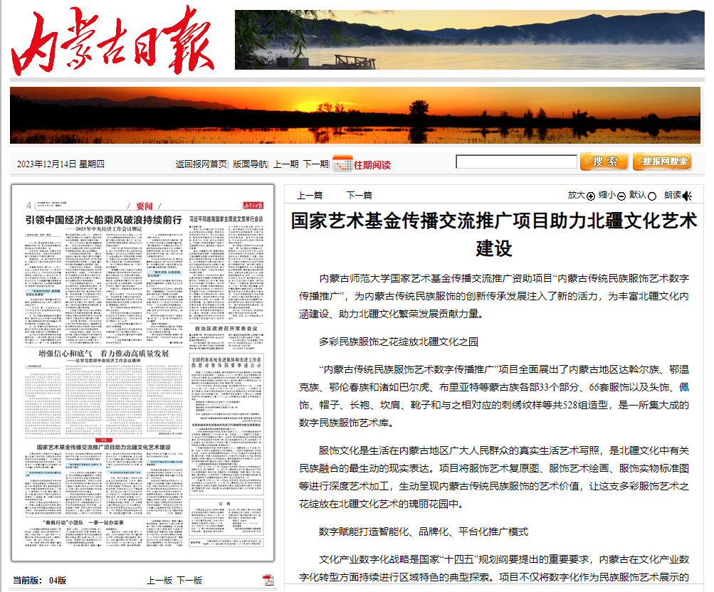 2026世界杯官网国家艺术基金传播交流推广资助项目“内蒙古传统民族服饰艺术数字传播推广”,为内蒙古传统民族服饰的创新传承发展注入了新的活力,为丰富北疆文化内涵建设、助力北疆文化繁荣发展贡献力量。