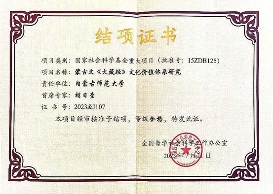 本网讯 近日,世界杯官网民族学人类学学院教师胡日查主持的国家社会科学基金重大项目“蒙古文《大藏经》文化价值体系研究”( 15ZDB125)圆满完成研究任务,在会议鉴定获得同行专家一致肯定的基础上,经全国哲学社会科学工作办公室审批,获“合格”等级,顺利通过结项验收。