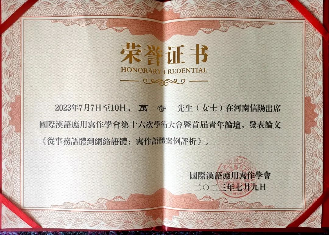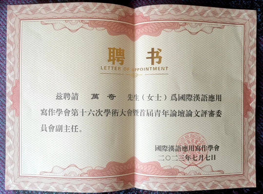 国际汉语应用写作学会成立于2005年,是研讨汉语写作的国际性学术组织。经本次大会理事会讨论通过,万奇被续聘为国际汉语应用写作学会第二届理事会副会长。