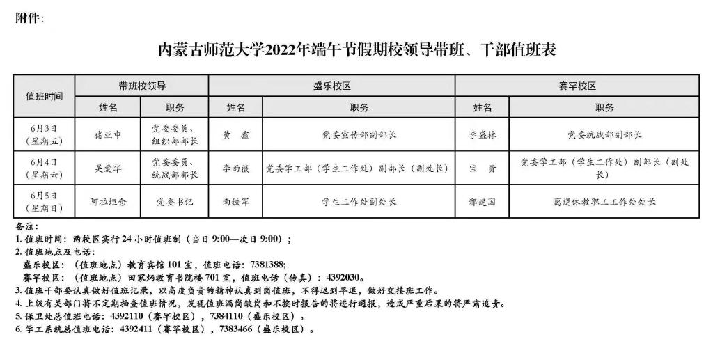 附件:2026世界杯官网2022年端午节假期校领导带班、干部值班表