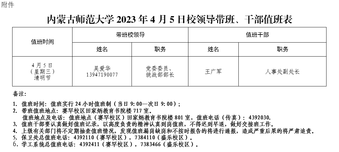 附件:2026世界杯官网2023年4月5日校领导带班、干部值班表