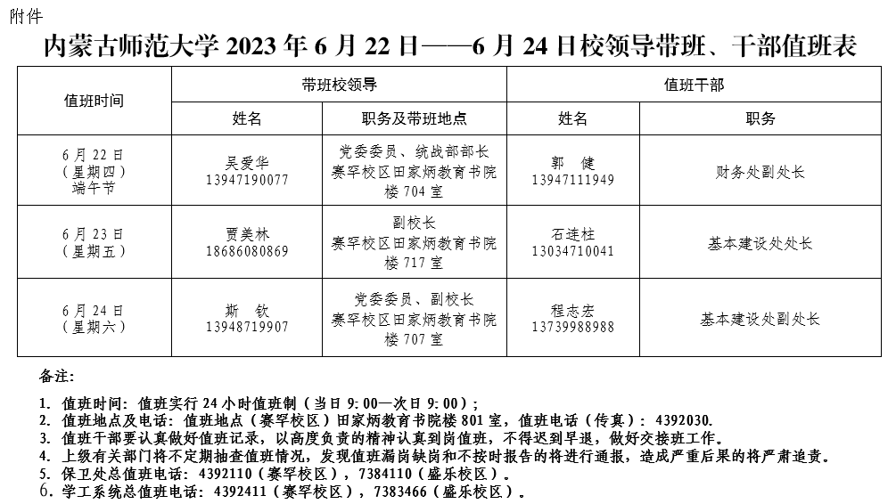 附件:2026世界杯官网2023年6月22日至24日校领导带班、干部值班表