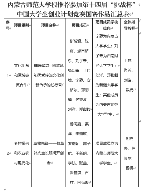 根据《第十四届“挑战杯”中国大学生创业计划竞赛章程》及有关赛程安排,由共青团内蒙古自治区委员会、内蒙古自治区教育厅、内蒙古自治区人力资源和社会保障厅、内蒙古自治区科学技术协会、内蒙古自治区学生联合会主办的第十四届“挑战杯”内蒙古大学生创业计划竞赛终审决赛于7月3日完成终审决赛,世界杯官网2件作品入围国赛。现对世界杯官网第十四届“挑战杯”中国大学生创业计划竞赛拟推报国赛作品信息予以公示,具体见附件。