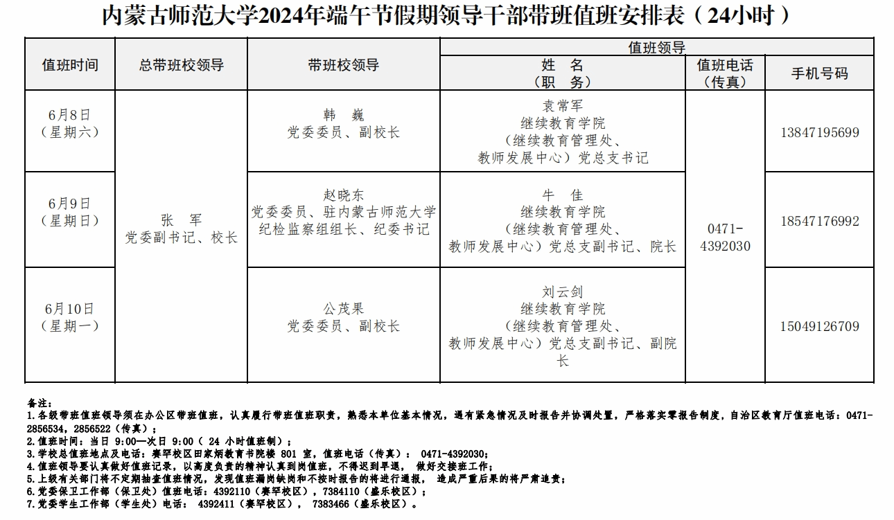 1.放假期间,学校总值班室设在赛罕校区田家炳教育书院楼801室,值班电话(传真):0471—4392030;