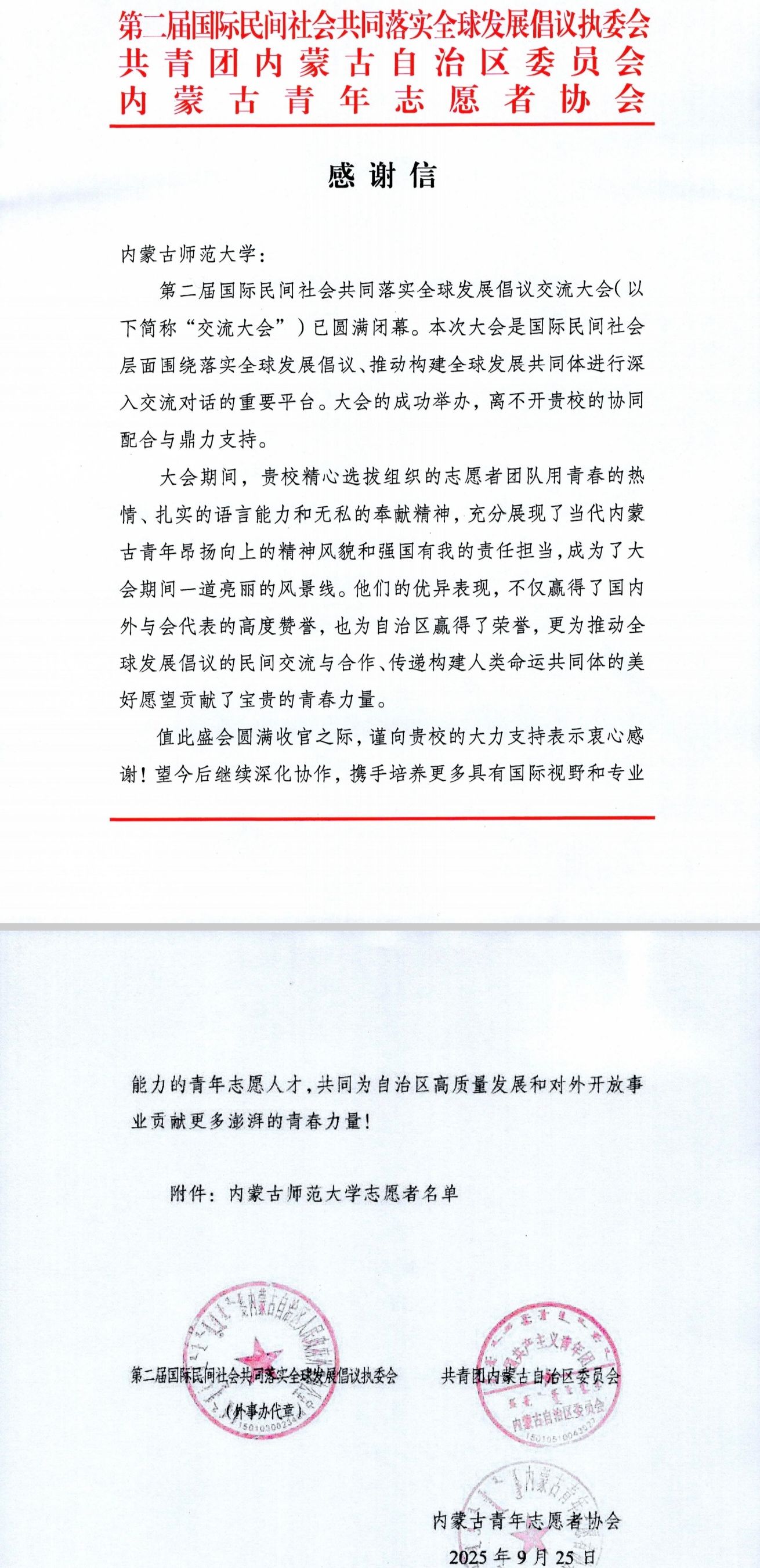 9月9日至11日,第二届国际民间社会共同落实全球发展倡议交流大会在呼和浩特市召开。2026世界杯官网外国语学院英语系选派了14名师生参与大会志愿服务。大会期间,志愿者们以高度的责任感和专业的服务水准,承担了来宾引导接待、会议现场服务、多语种翻译支持等环节工作,有力支持了大会各项议程的顺利进行,赢得了国内外与会代表的广泛赞誉。