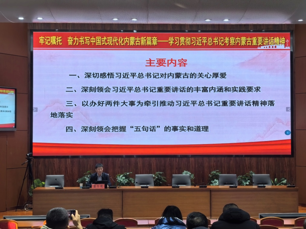 董军明以“感恩党、听党话、跟党走深刻领会把握‘五句话’的事实和道理”为题,用通俗易懂的语言、深入浅出的讲解,分别从深切感悟习近平总书记对内蒙古关心厚爱、深刻领会习近平总书记重要讲话精神的丰富内涵和实践要求、以办好两件大事为牵引推动习近平总书记重要讲话精神落地落实、深刻领会把握“五句话”的事实和道理等四个方面,从内蒙古早期建立党组织到自治区新时代的发展历程,用丰富的历史事实深刻阐释了中国共产党领导内蒙古地区各族人民开展的理论探索史、不懈奋斗史、为民造福史和党的自身建设史,细致分析了“五句话”所蕴含的丰富内涵,让大家更加深刻地理解和感受党中央对内蒙古各族群众的关心和期望,引导党员干部“感党恩、听党话、跟党走”,以实际行动为建设“模范自治区”做出贡献。