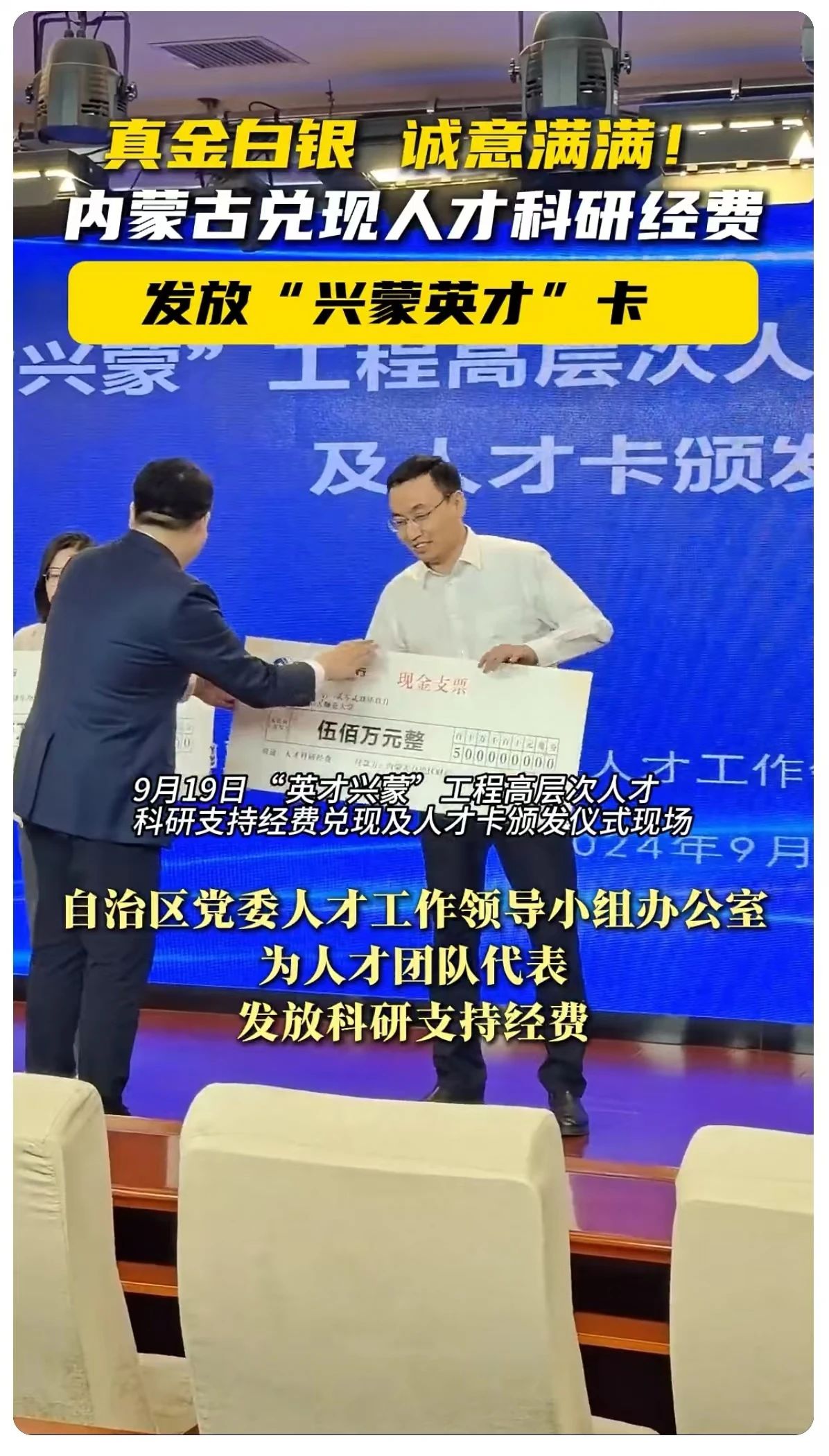 本网讯9月19日,内蒙古自治区政府新闻办召开新闻发布会,通报了第十二届内蒙古“英才兴蒙”高层次人才合作交流会暨人才创新创业周活动将于9月23日至30日在内蒙古举办。会后举行了“英才兴蒙”工程高层次人才科研支持经费兑现及人才卡颁发仪式,为世界杯官网党委委员、副校长公茂果团队发放当年度科研支持经费500万元,为三类人才代表、世界杯官网蒙古学学院院长满全发放人才卡。