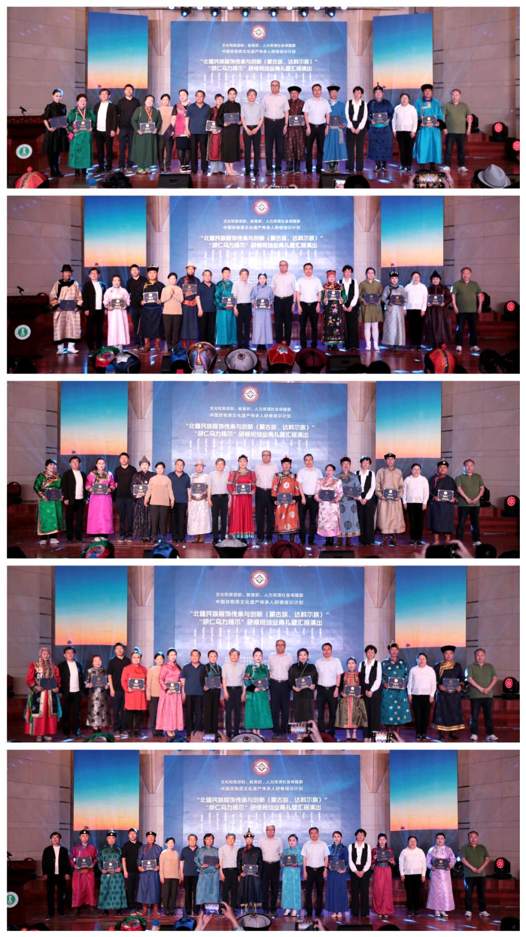 朝戈金、阿拉坦仓、公茂果、张丽辉及相关负责同志共同为“北疆民族服饰传承与创新(蒙古族、达斡尔族)”“胡仁乌力格尔”研修班全体学员颁发结业证书。