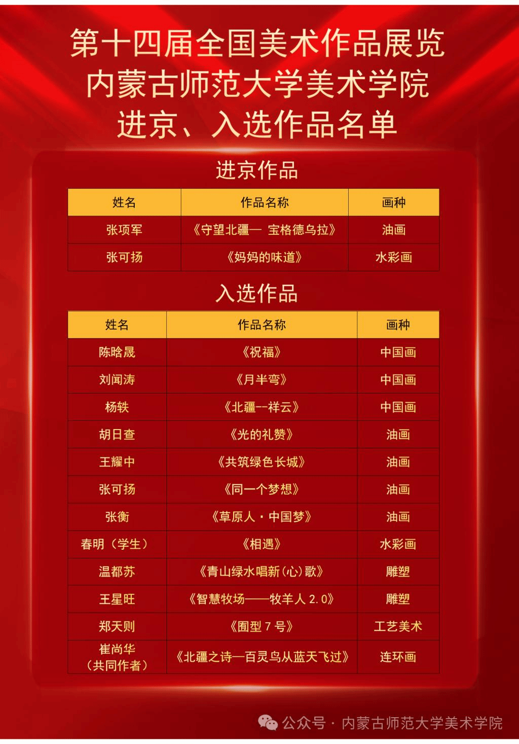 本网讯 在刚刚揭晓的第十四届全国美术作品展复评结果中,世界杯官网美术学院师生共有14件作品入选各类画种,包括中国画3件、油画5件、水彩画2件、雕塑2件、综合画种1件、工艺美术1件。其中,张项军的油画作品《守望北疆——宝格德乌拉》和张可扬的水彩画作品《妈妈的味道》获得进京展览资格。