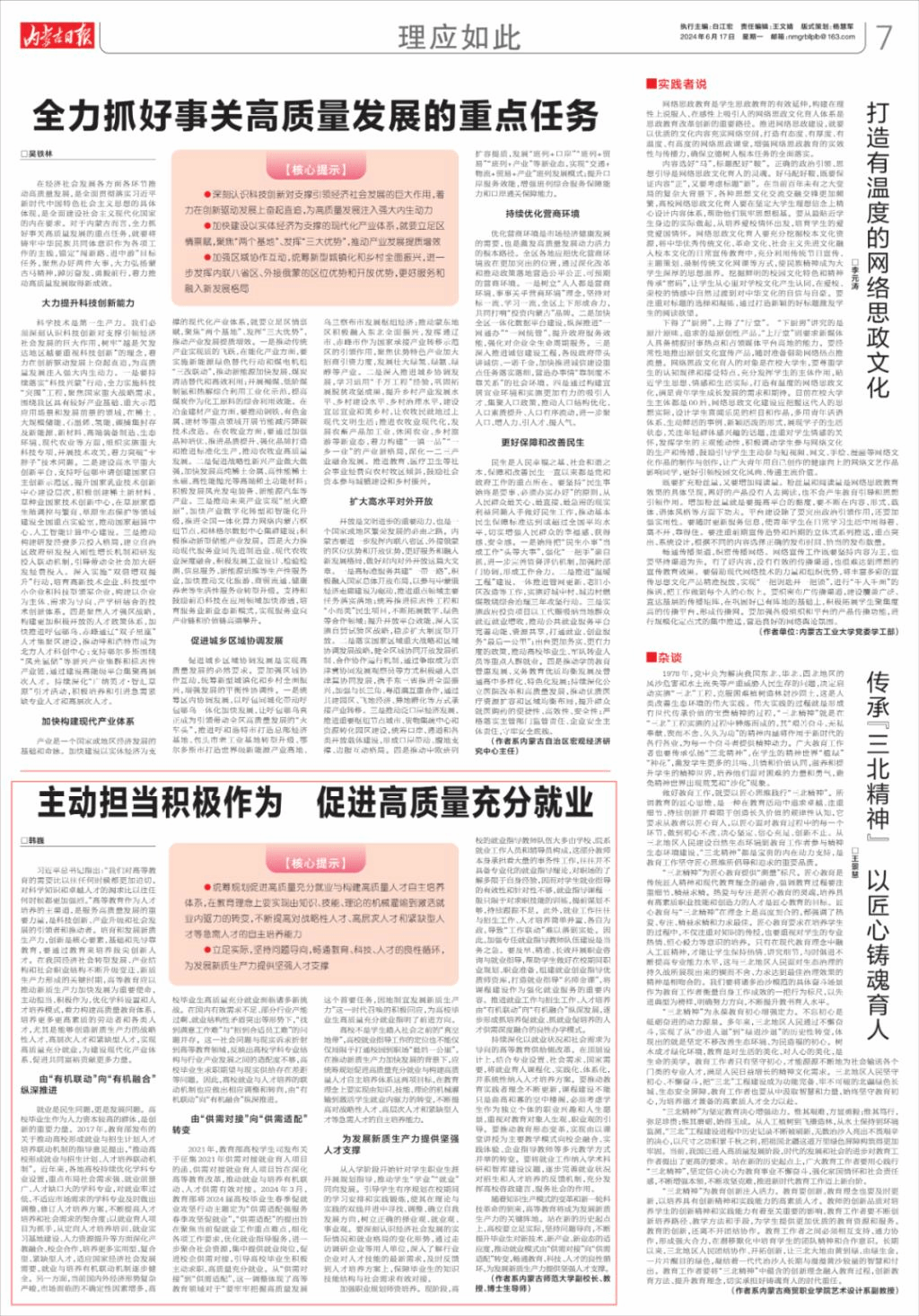 6月17日,《内蒙古日报》第7版全文刊载世界杯官网党委委员、副校长韩巍的文章《主动担当积极作为 促进高质量充分就业》。
