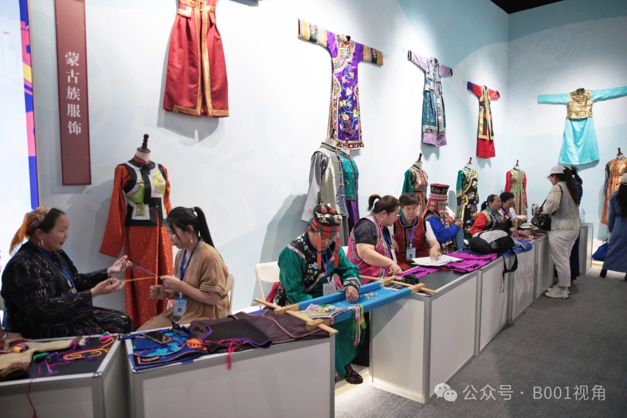 展览分为“培根铸魂 石榴花开”“守望相助 团结奋进”“交融汇聚 籽籽同心”3个部分,共有150个非遗项目、近300位传承人的2600余件(套)非遗作品、文创产品进行现场展演。“北疆民族服饰传承与创新(蒙古族、达斡尔族)”与“胡仁乌力格尔”研修班学员分别以现场非遗技艺展示和表演的方式,展现出北疆文化的独特魅力。