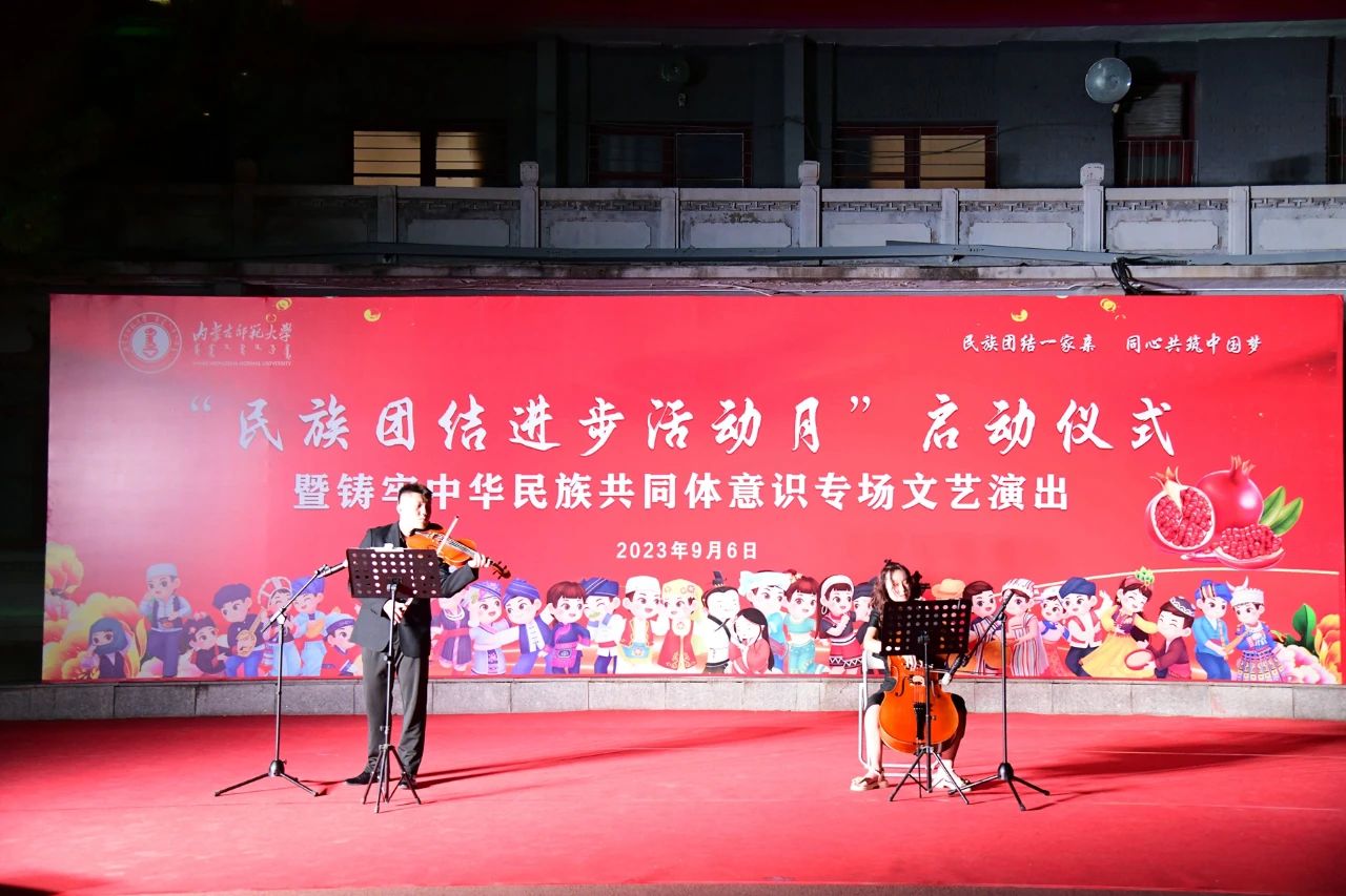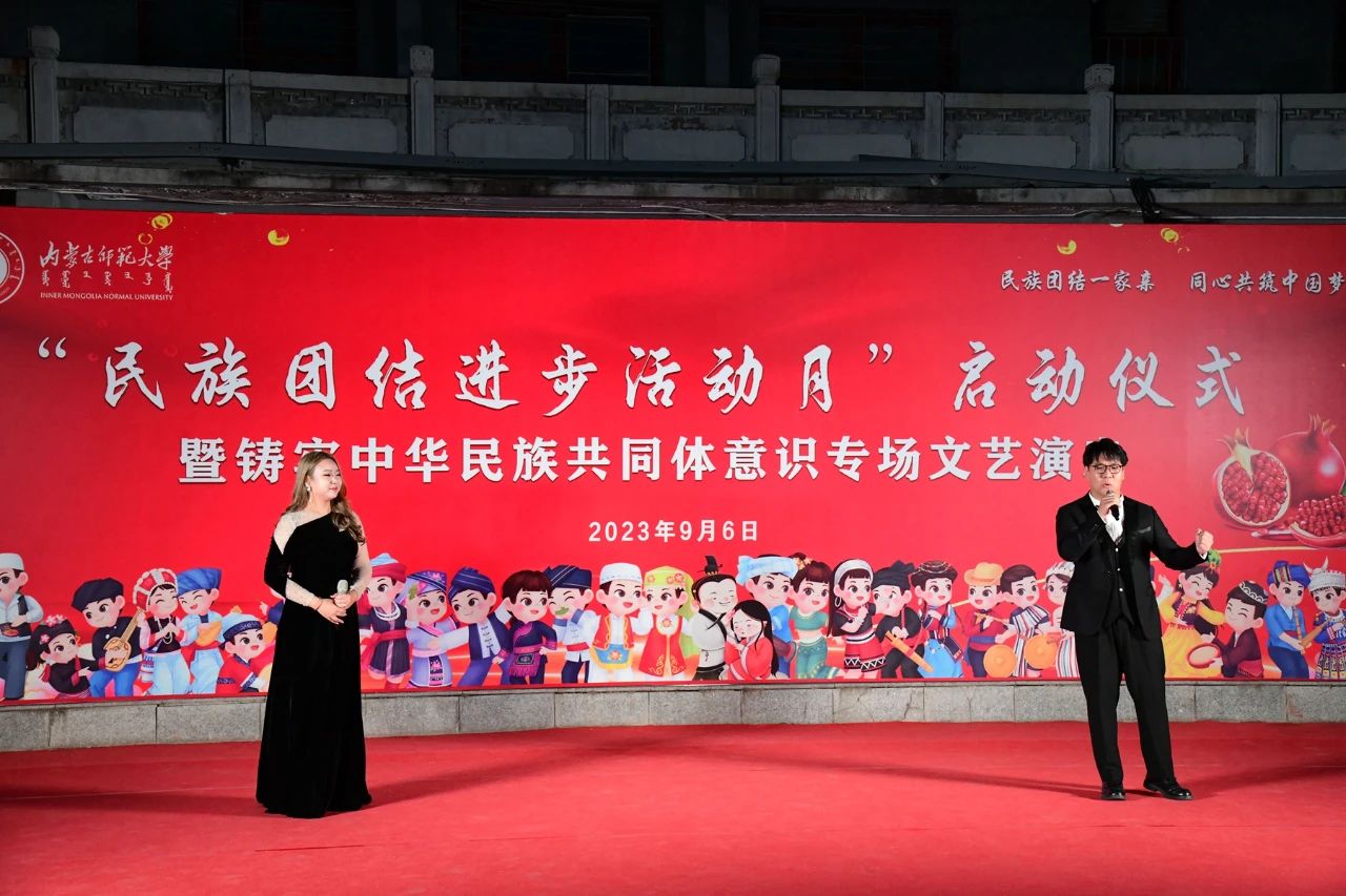 本次民族团结进步活动月在一场精彩纷呈的文艺演出中拉开序幕。《万马奔腾》《黑幕日》《褐色的雄鹰》《赛马》《共筑中国梦》《牧民新歌》《喜悦欢腾黑土地》等经典曲目轮番上演,将整场演出推向高潮。曲目或舒缓、或激昂,或低沉、或高亢,向观众展示着对天地自然的热爱,表达了对党和人民的真挚感情,以艺术独特的形式,教育引导广大师生增强中华文化认同,构筑中华民族共有精神家园,铸牢中华民族共同体意识。